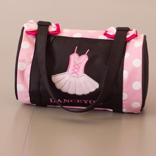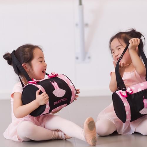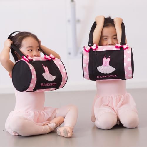 Dot drum bag with a ballet tutu design and pink bows, perfect for dancers.